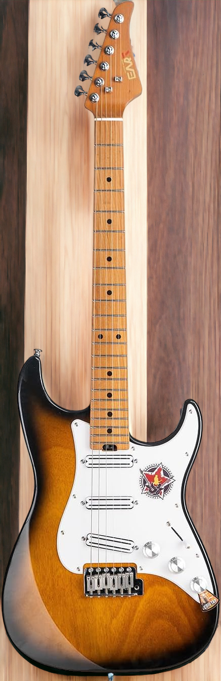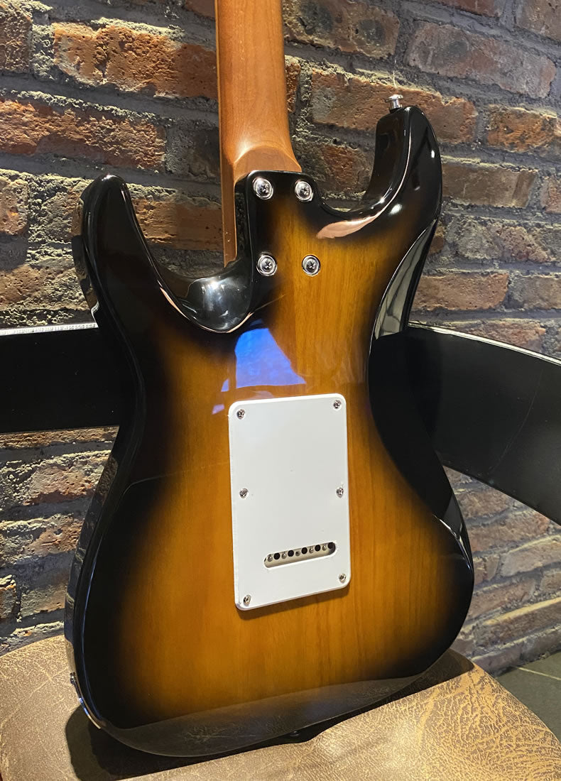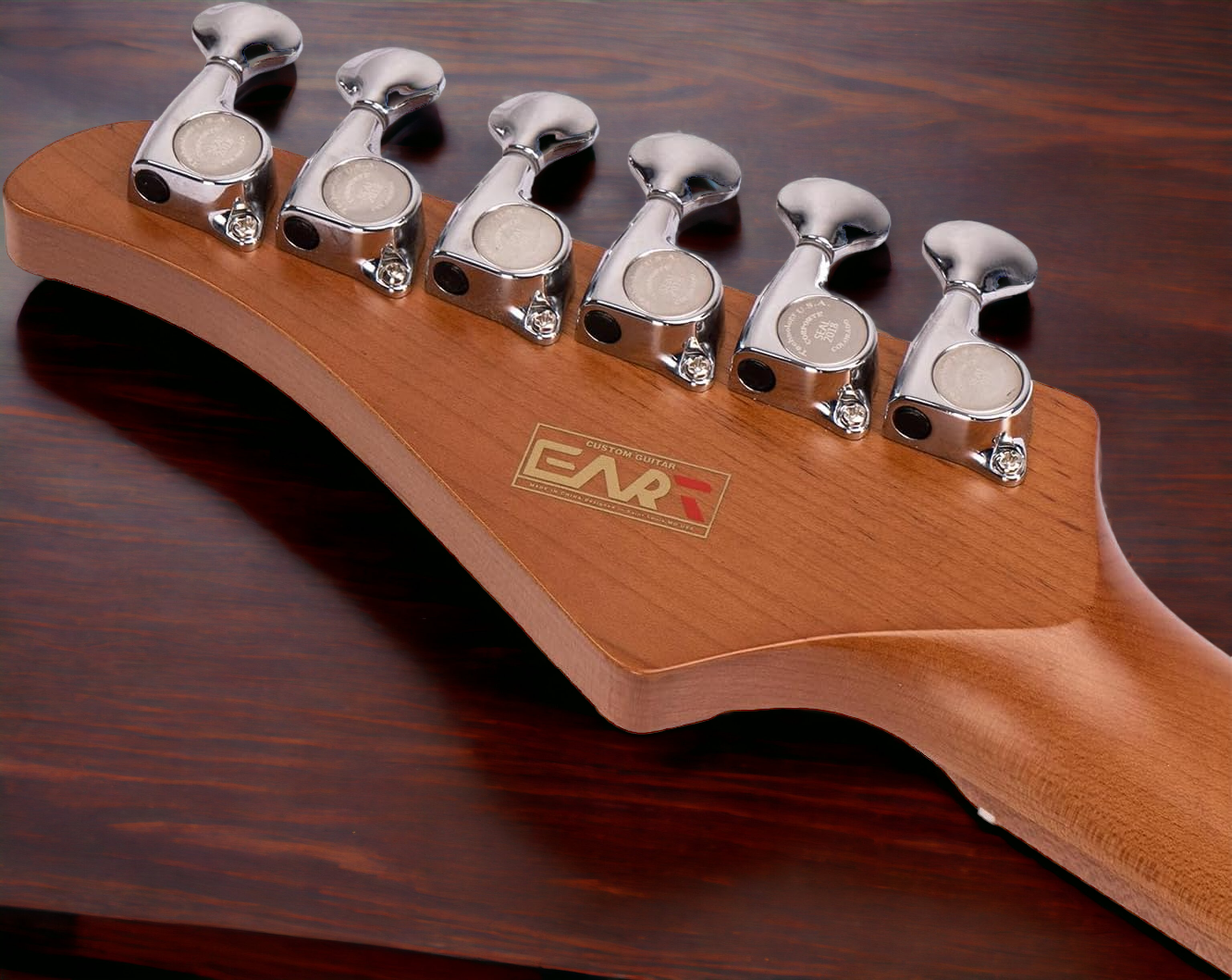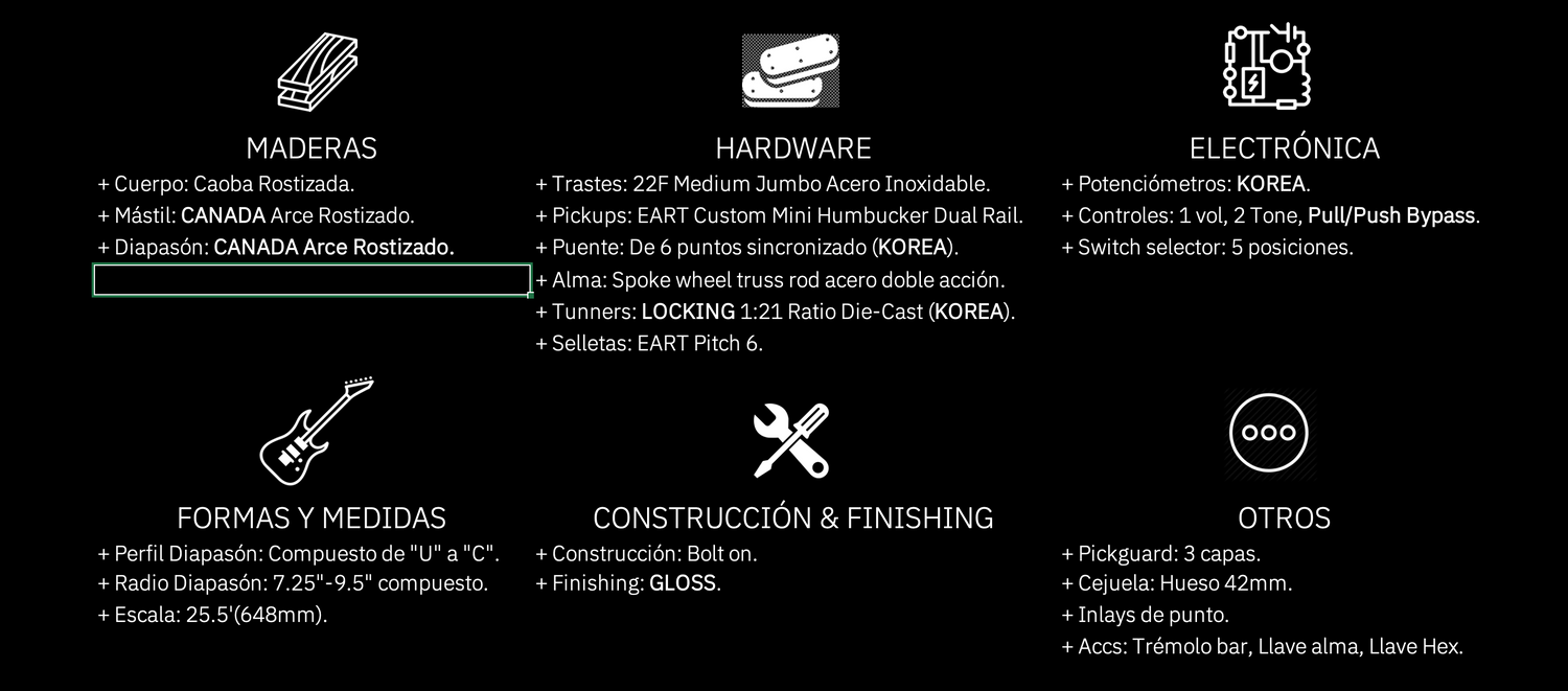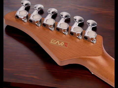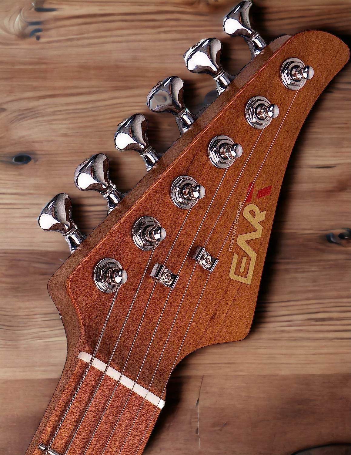 Roasted Mahogany Body, 3 DUAL RAIL mini humbuckers, PUSH/PULL BRIDGE BYPASS, 6-point bridge with TREMOLO BAR (Korea), LOCKING TUNERS as standard (Korea). STAINLESS STEEL frets, ... and more ELITE details. You won't find these features on any guitar of this quality, and at this price level. Do you want to know how it sounds? LISTEN TO IT IN OUR EART ARENA.