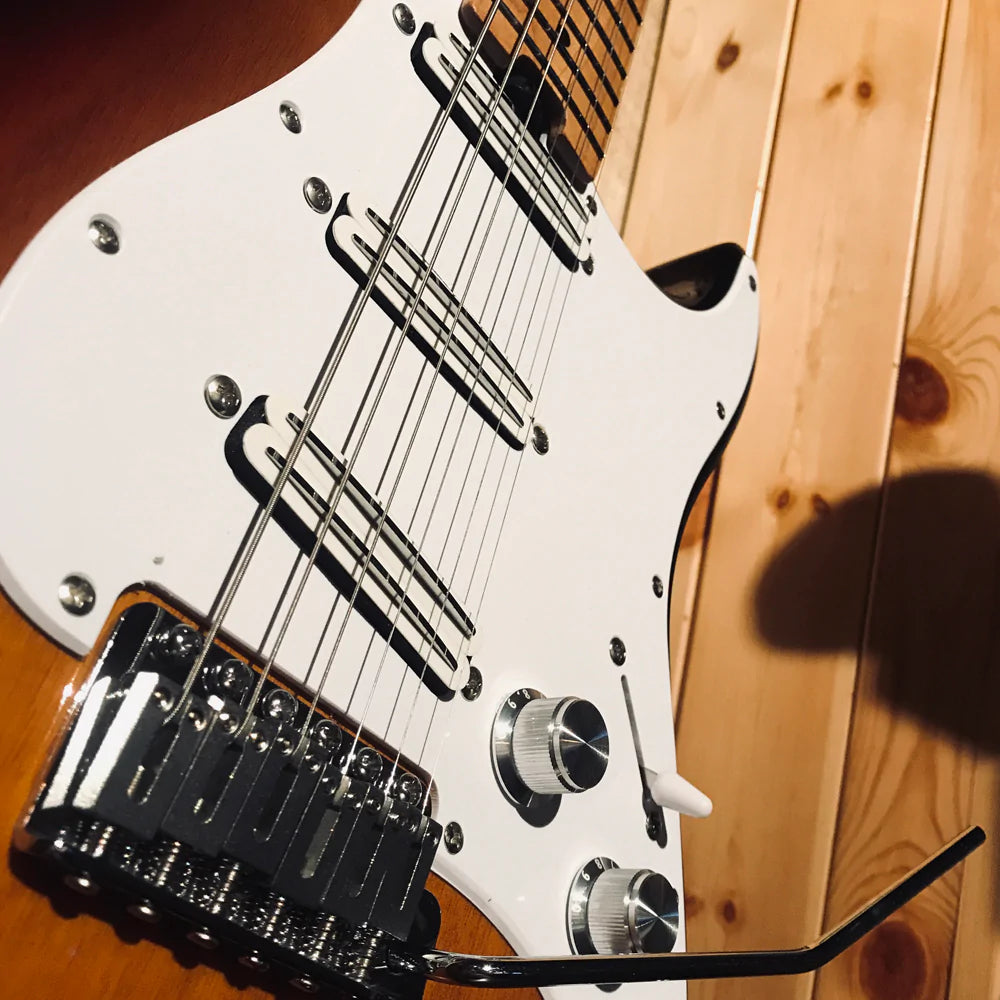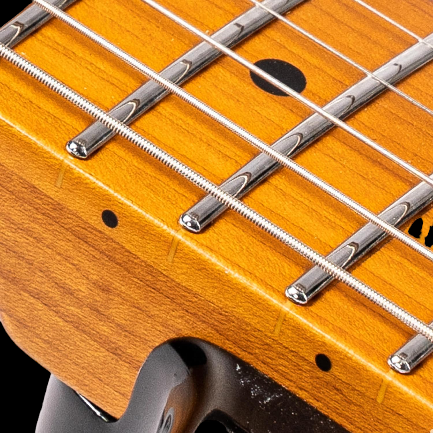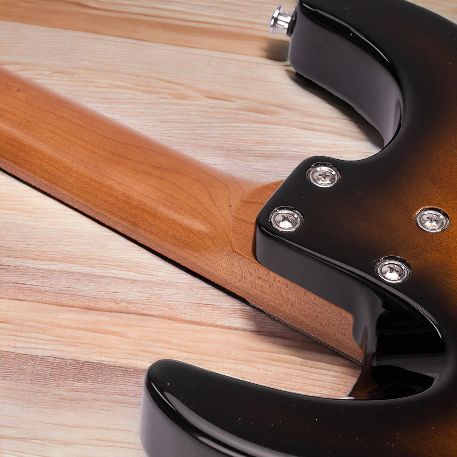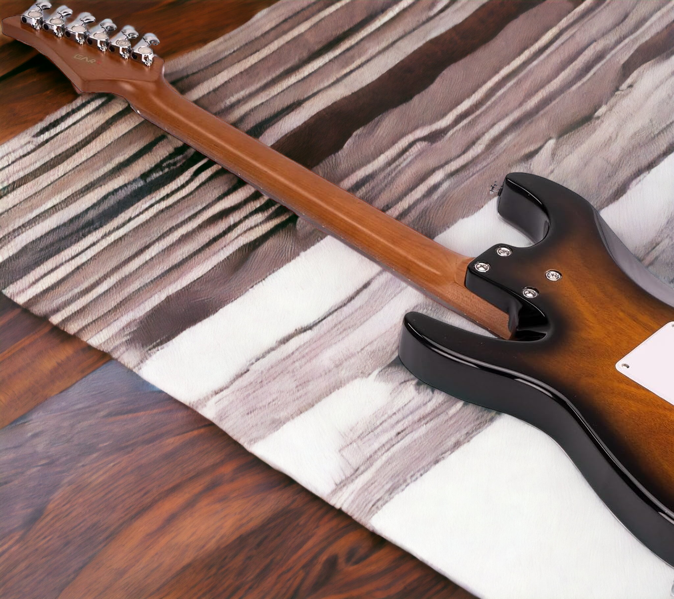 Roasted Mahogany Body, 3 DUAL RAIL mini humbuckers, PUSH/PULL BRIDGE BYPASS, 6-point bridge with TREMOLO BAR (Korea), LOCKING TUNERS as standard (Korea). STAINLESS STEEL frets, ... and more ELITE details. You won't find these features on any guitar of this quality, and at this price level. Do you want to know how it sounds? LISTEN TO IT IN OUR EART ARENA.