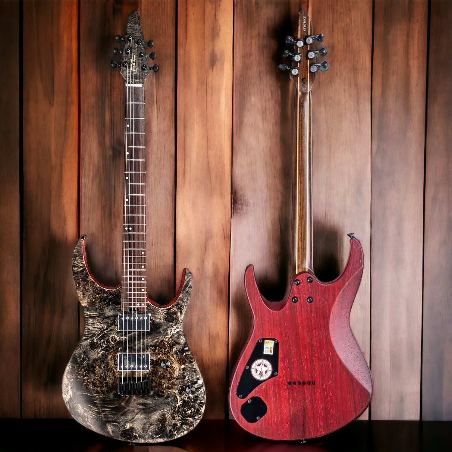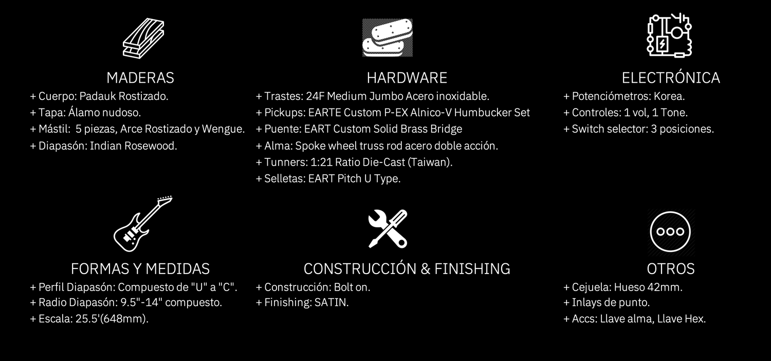 The TREASURE OF ROCK and Metal... the most modern guitar of its kind...OPEN PORE Satin Finish. HR configuration. 5 PIECES neck, built in ROASTED MAPLE AND WENGUE . STAINLESS STEEL frets. Pickups EART CUSTOM ALNICO V COVERED , EART Solid Hardtail bridge, PREMIUM machine heads sealed-gear made in Taiwan. You won't find these features on any guitar of this quality, and at this price level. Do you want to know how it sounds? LISTEN TO IT IN OUR EART ARENA.