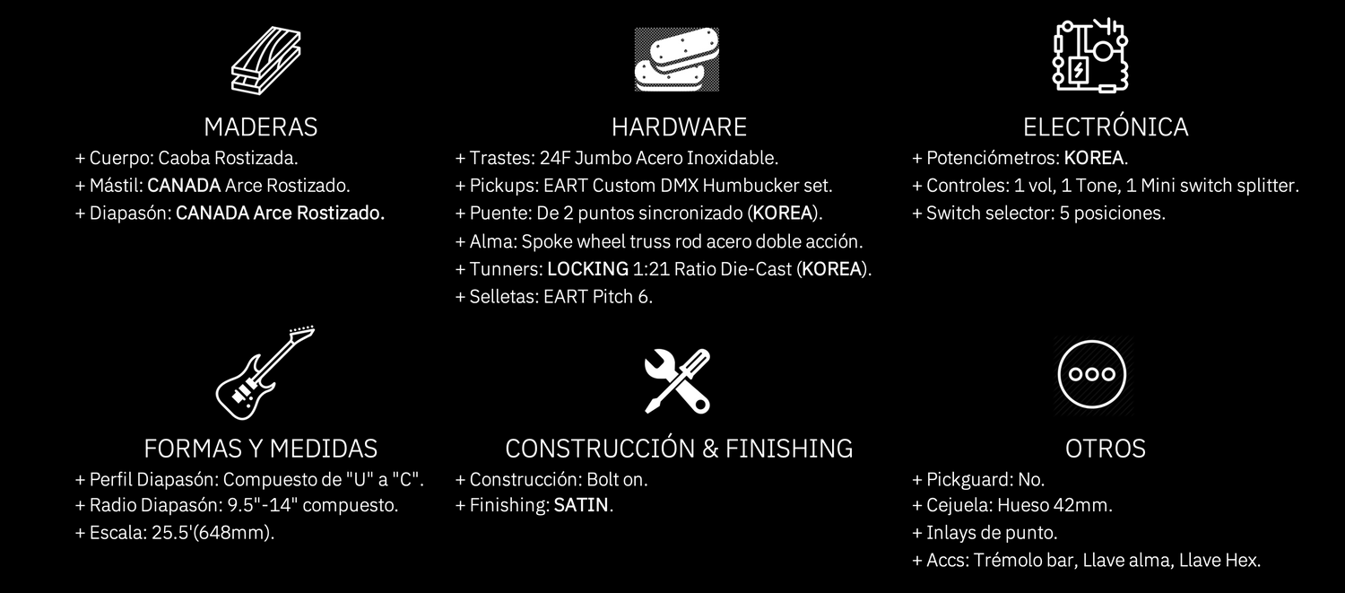 Configuración HH. Switch de 5 posiciones y Mini-Switch para splitear Single o Humbucker. 10 combinaciones de tono diferentes. Maderas roasted, TRÉMOLO BAR. LOCKING TUNERS de serie (Taiwan). , Trastes STAINLESS STEEL, LOCKING TUNERS (Optional), COLORES MODERNOS. Todo el rock que imaginas en una sola guitarra.