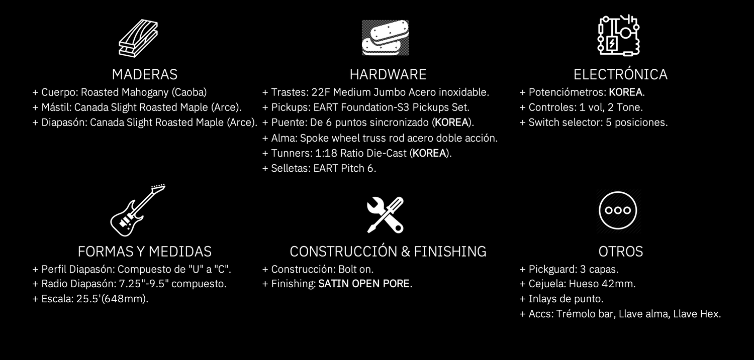 NUEVO LANZAMIENTO !!! LA EART NEXUS S1, Configuración SSS, FINISH SATIN OPEN PORE !!! Y lo mejor de todo: A UN VALOR INCREÍBLE!!! Pickups sin acoples, puente EART Custom sincronizado de 6 puntos/Trémolo, Y COMO SIEMPRE: Trastes STAINLESS STEEL ROUND ENDS. Maderas roasted. No vas a encontrar ninguna guitarra similar con esta calidad y en este valor de precio...